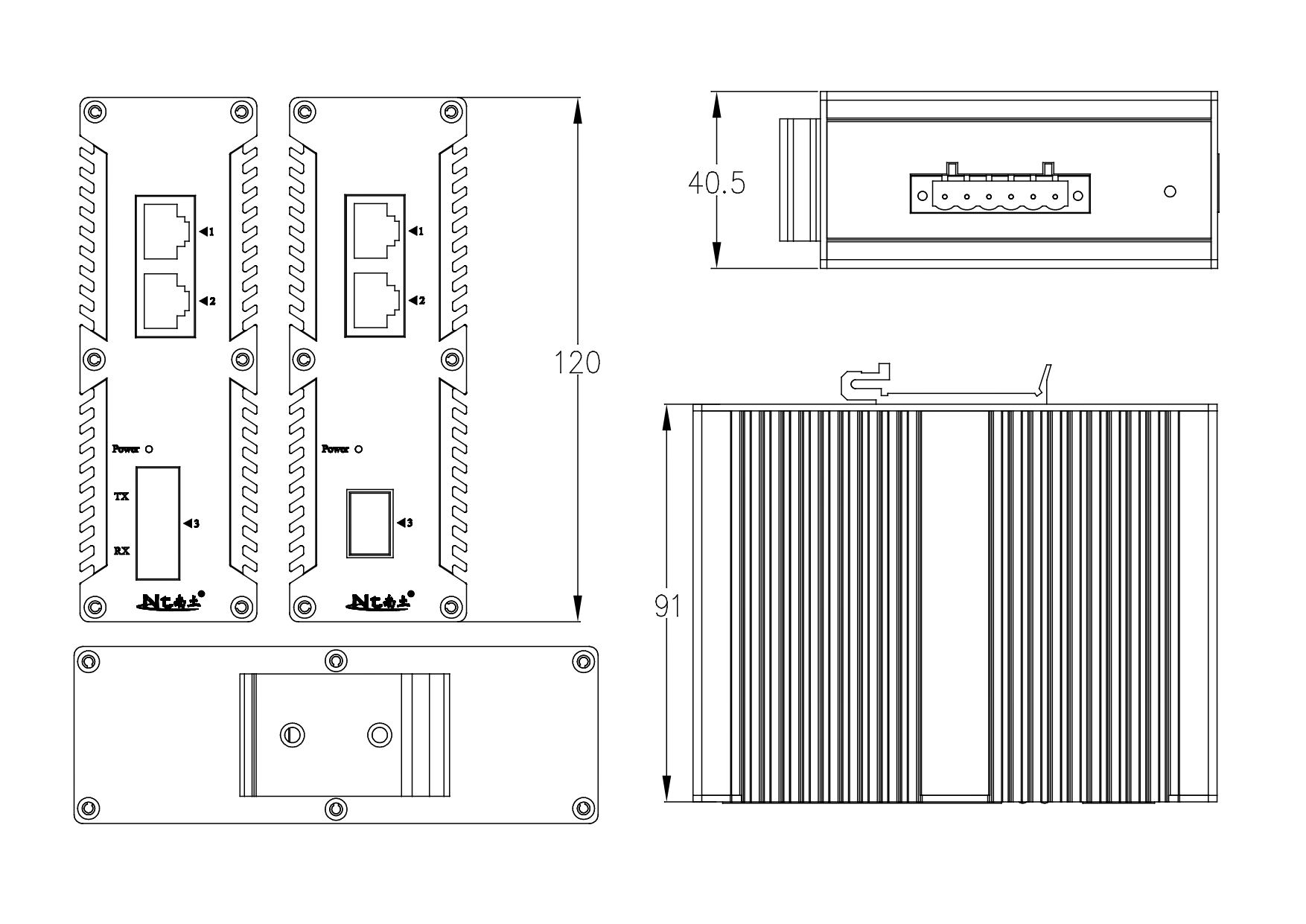 外殼:金屬材質 安裝:DIN 卡軌式,壁掛式安裝 重量:0.36Kg 尺寸:120X91x40.5mm(長 x 寬 x 高) |