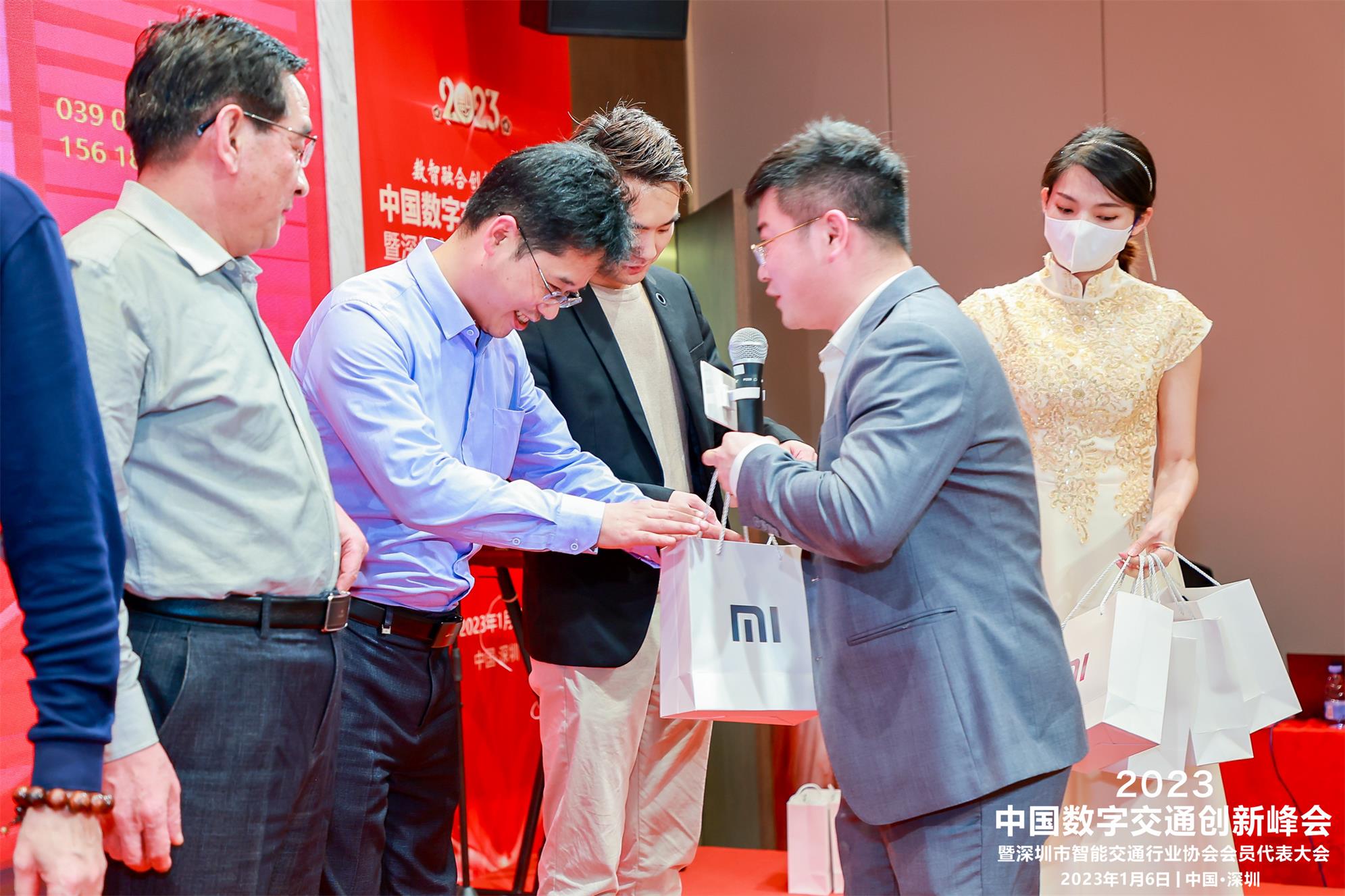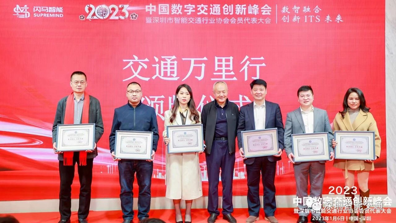 ▲深圳市智能交通行業(yè)協(xié)會專家委常務副主任、天地智能交通研究院院長鄧文杰為獲獎企業(yè)頒獎并合影