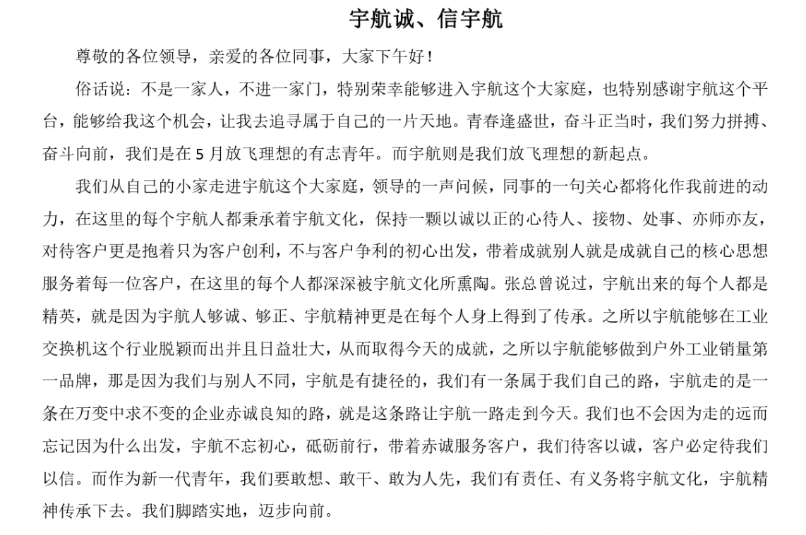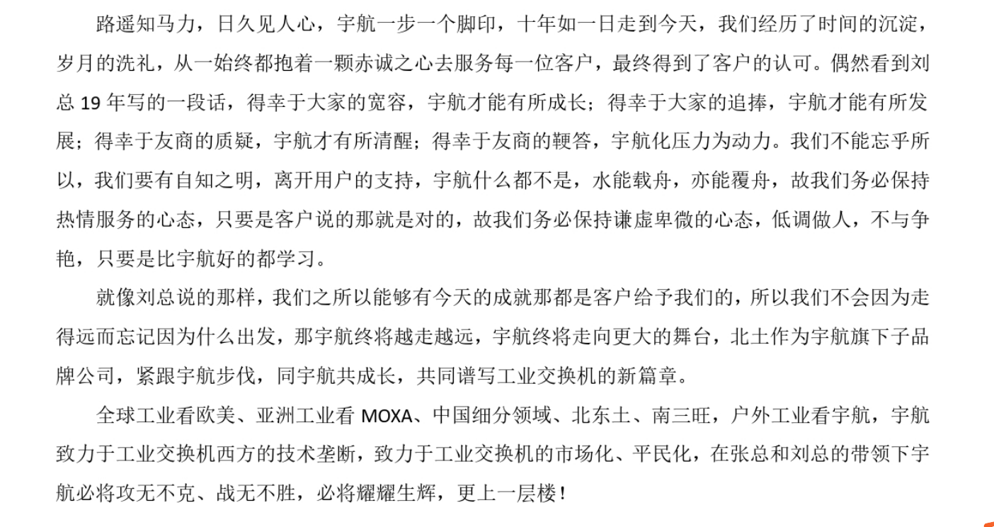 近期,宇航工業(yè)交換機(jī)在全國(guó)各地的展會(huì)正如火如荼地進(jìn)行,因此,有幾個(gè)同事因參展未能參加此次比賽。其中,宇航工業(yè)交換機(jī)旗下子公司子品牌北土工業(yè)參賽選手“孫全龍”的演講稿,被評(píng)為最佳演講稿。宇航工業(yè)交換機(jī)總設(shè)計(jì)師張總對(duì)此演講稿給予了高度的肯定,也向在座所有人傳遞了主動(dòng)、激情、真誠(chéng)、用心”的做事態(tài)度。