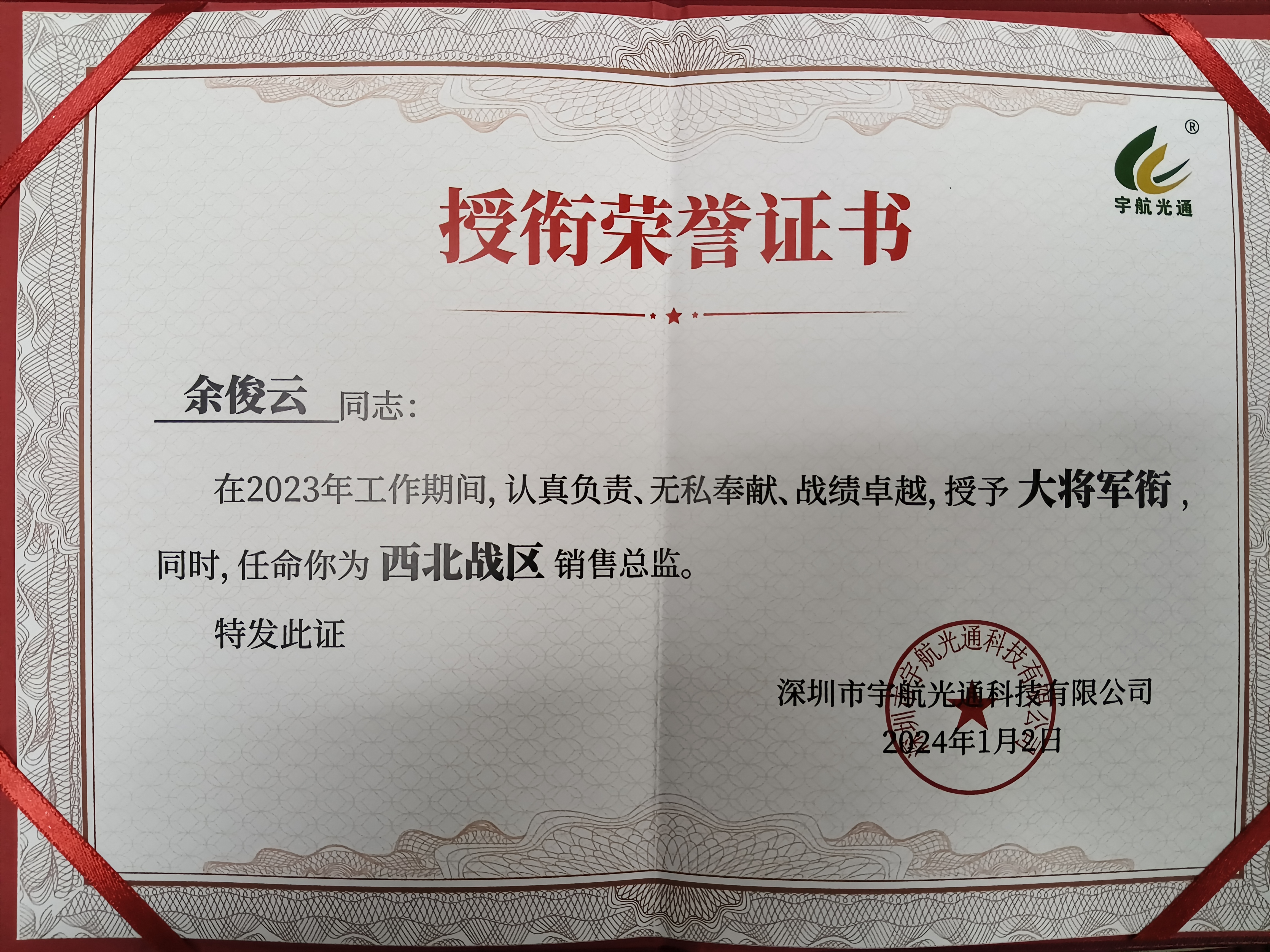 宇航工業交換機余俊云在2023年工作期間,認真負責、無私奉獻、戰績卓越,授予“大將軍”銜,同時,任命為西北戰區銷售總監。