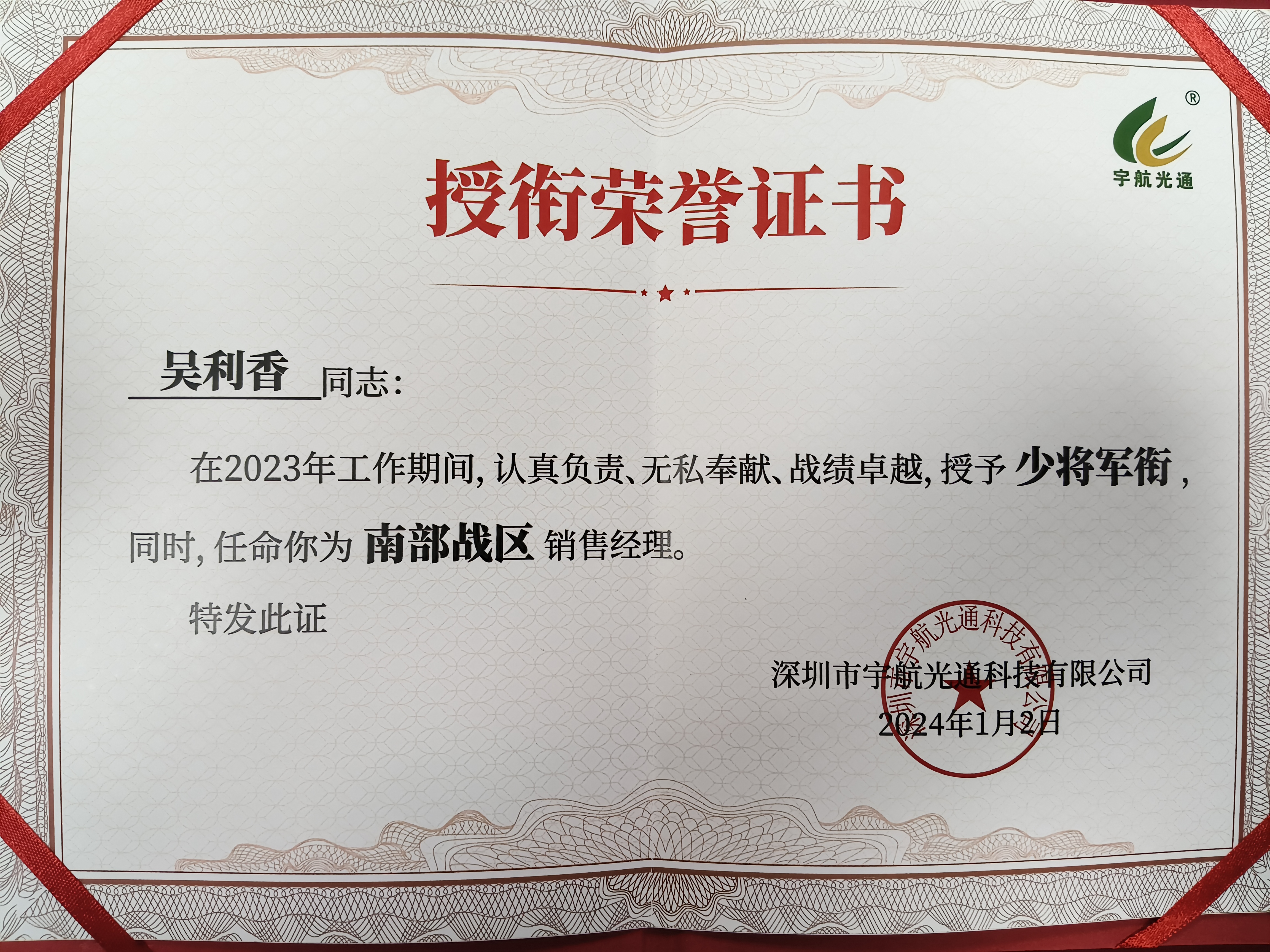 宇航工業交換機吳利香在2023年工作期間,認真負責、業績斐然,表現出色,授予“少將軍”銜,同時,任命為南部戰區銷售經理。