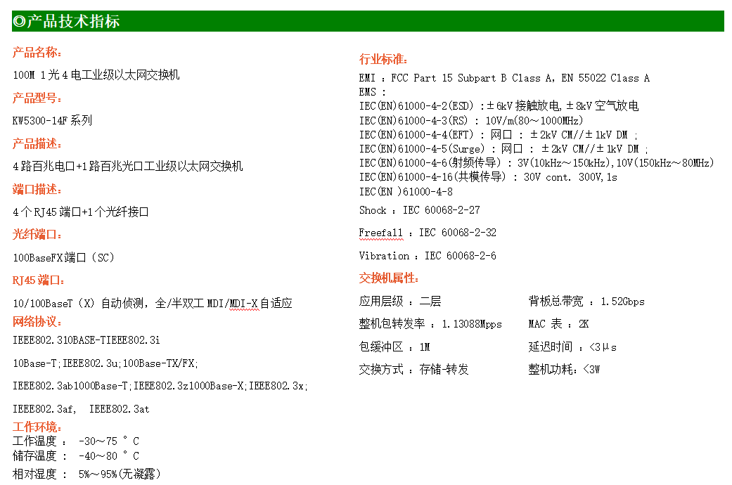 4路百兆電口+1路百兆FX光口工業(yè)級以太網(wǎng)交換機,支持4個10Base-T/100Base-TX電口和1個100Base-X光口。產(chǎn)品符合FCC、CE、ROHS標準。KW5300-14F系列交換機具有-30℃~75℃的工作溫度,具有超強的堅固度能適應(yīng)各種嚴苛環(huán)境,也可以非常方便的安置在空間緊湊的控制箱中。導(dǎo)軌的安裝特性、寬溫操作及擁有IP40防護等級的外殼及LED指示燈,使AF14F成為一個即插即用的工業(yè)級設(shè)備,為用戶的以太網(wǎng)設(shè)備聯(lián)網(wǎng)提供可靠、便捷的解決方案。