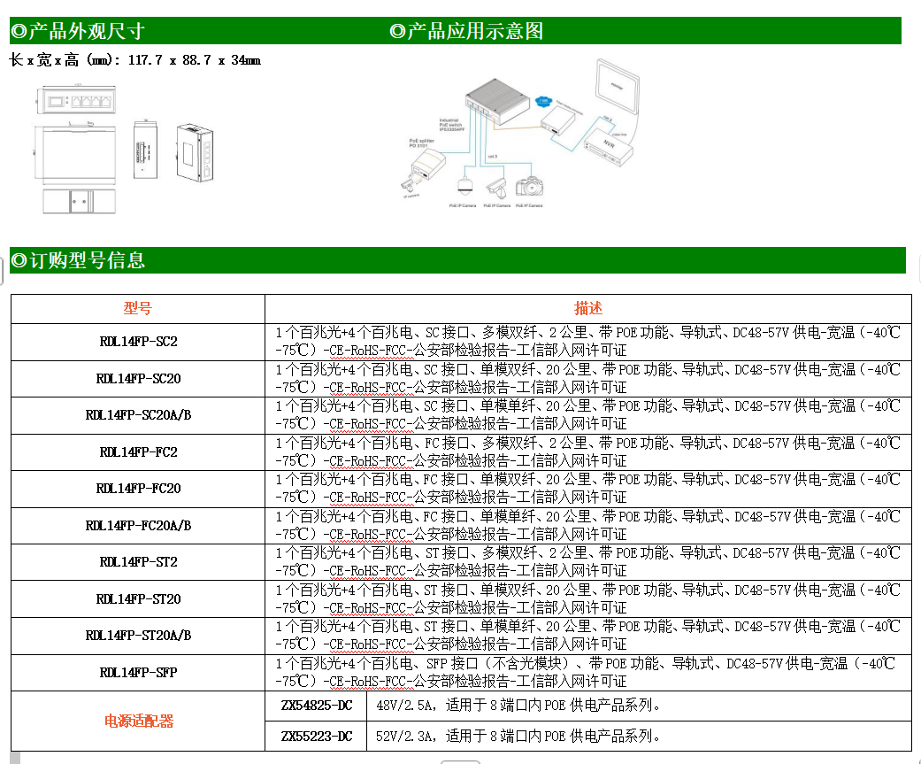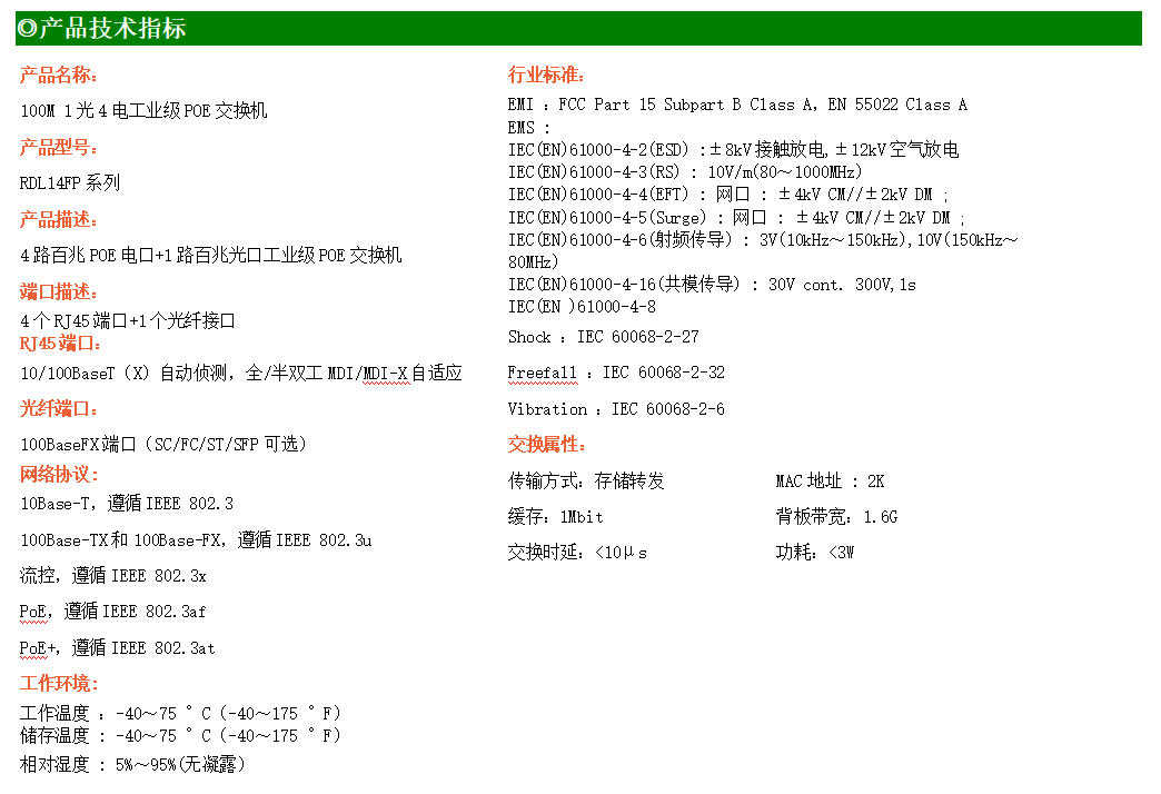 4路百兆POE電口+1路百兆SC光口工業級以太網POE交換機,支持4個10/100Base-TX電口和1個100Base-X光口。產品符合FCC、CE、ROHS標準。RDL14FP系列交換機具有-40℃~75℃的工作溫度,具有超強的堅固度能適應各種嚴苛環境,也可以非常方便的安置在空間緊湊的控制箱中。導軌的安裝特性、寬溫操作及擁有IP40防護等級的外殼及LED指示燈,使RDL14FP成為一個即插即用的工業級設備,為用戶的以太網設備聯網提供可靠、便捷的解決方案。