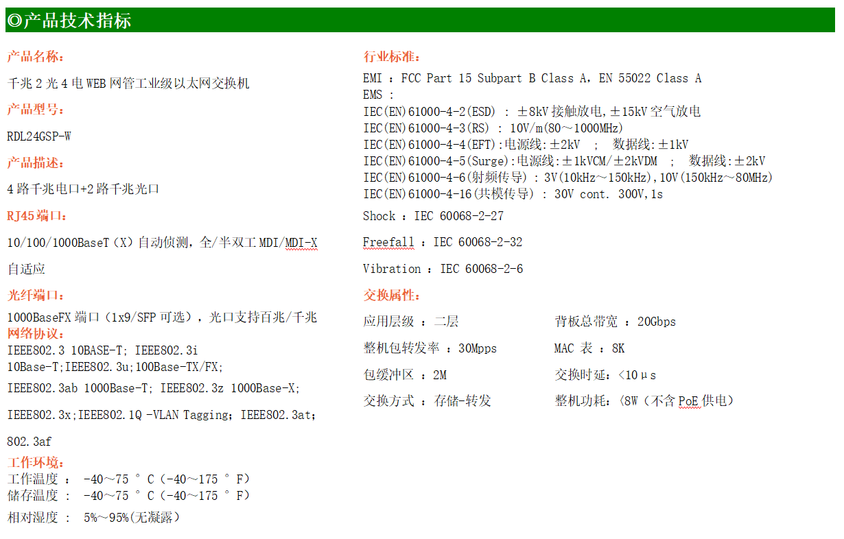 RDL24GSP-W-SFP系列WEB管理工業級以太網PoE交換機,產品符合FCC、CE、ROHS標準,支持工業現場所需的以太網二層協議,保證通信網絡的穩定性。該系列交換機采用低功耗、無風扇設計,確保無噪聲干擾,同時支持-40~75℃工作溫度和良好的EMC電磁兼容性能,保證在惡劣的工業環境中保持穩定的工作,為工廠自動化,智能交通,視頻監控等工業應用領域組建快速穩定的網絡終端接入網絡提供安全可靠的解決方案。