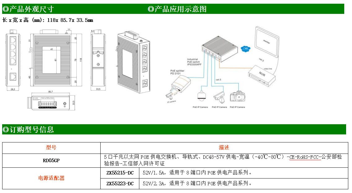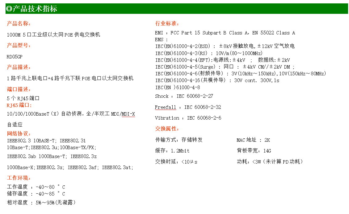 1路千兆上聯電口+4路千兆下聯電口工業級以太網POE交換機,支持1個10/100/1000Base-TX上聯電口和4個100Base-T/1000Base-TX下聯POE電口。產品符合FCC、CE、ROHS標準。RD05GP交換機具有-40℃~80℃的工作溫度,具有超強的堅固度能適應各種嚴苛環境,也可以非常方便的安置在空間緊湊的控制箱中。導軌的安裝特性、寬溫操作及擁有IP40防護等級的外殼及LED指示燈,使RD05GP成為一個即插即用的工業級設備,為用戶的以太網設備聯網提供可靠、便捷的解決方案。