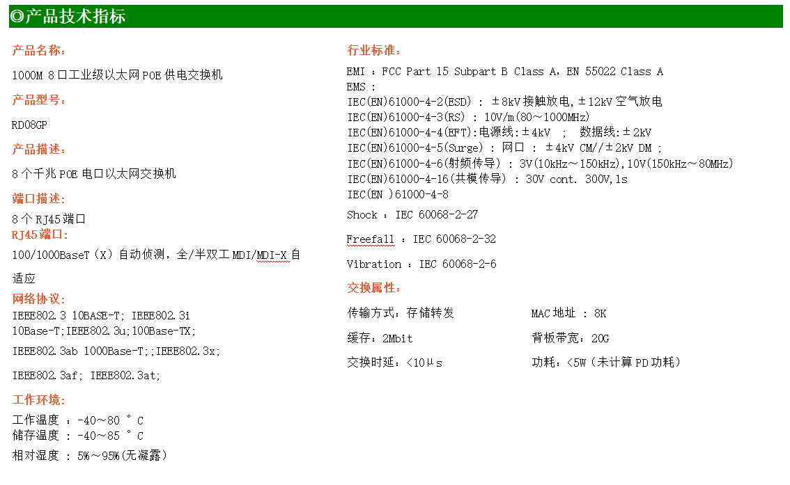 8路千兆電口工業級以太網POE交換機,支持8個100Base-T/1000Base-TX POE電口。產品符合FCC、CE、ROHS標準。RD08GP交換機具有-40℃~80℃的工作溫度,具有超強的堅固度能適應各種嚴苛環境,也可以非常方便的安置在空間緊湊的控制箱中。導軌的安裝特性、寬溫操作及擁有IP40防護等級的外殼及LED指示燈,使RD08GP成為一個即插即用的工業級設備,為用戶的以太網設備聯網提供可靠、便捷的解決方案。
