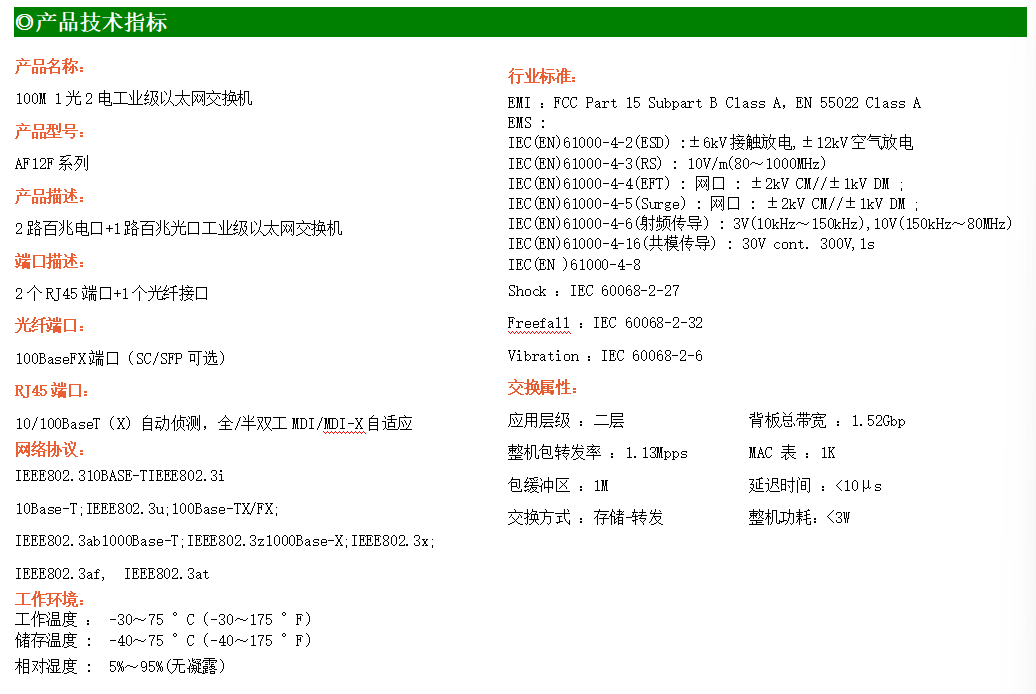 2路百兆電口+1路百兆SC光口工業(yè)級以太網(wǎng)交換機,支持2個10Base-T/100Base-TX電口和1個100Base-X光口。產(chǎn)品符合FCC、CE、ROHS標準。AF12F系列交換機具有-30℃~75℃的工作溫度,具有超強的堅固度能適應各種嚴苛環(huán)境,也可以非常方便的安置在空間緊湊的控制箱中。導軌的安裝特性、寬溫操作及擁有IP40防護等級的外殼及LED指示燈,使AF12F成為一個即插即用的工業(yè)級設備,為用戶的以太網(wǎng)設備聯(lián)網(wǎng)提供可靠、便捷的解決方案。