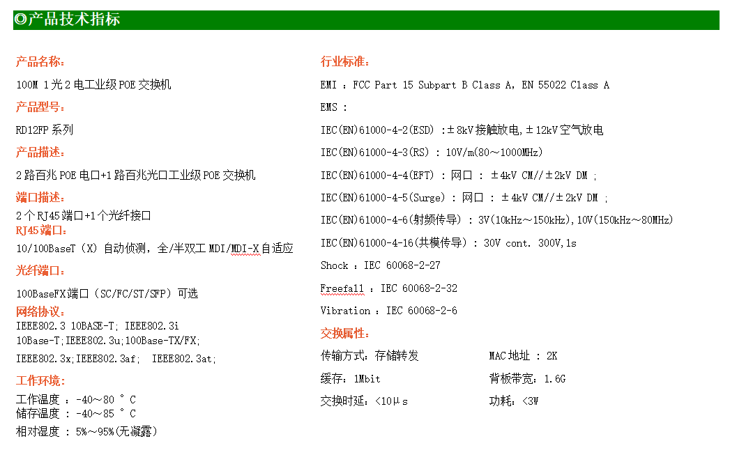 2路百兆POE電口+1路百兆SC光口工業(yè)級以太網(wǎng)POE交換機(jī),支持2個10/100Base-TX電口和1個100Base-X光口。產(chǎn)品符合FCC、CE、ROHS標(biāo)準(zhǔn)。RD12FP系列交換機(jī)具有-40℃~80℃的工作溫度,具有超強(qiáng)的堅固度能適應(yīng)各種嚴(yán)苛環(huán)境,也可以非常方便的安置在空間緊湊的控制箱中。導(dǎo)軌的安裝特性、寬溫操作及擁有IP40防護(hù)等級的外殼及LED指示燈,使RD12FP成為一個即插即用的工業(yè)級設(shè)備,為用戶的以太網(wǎng)設(shè)備聯(lián)網(wǎng)提供可靠、便捷的解決方案。