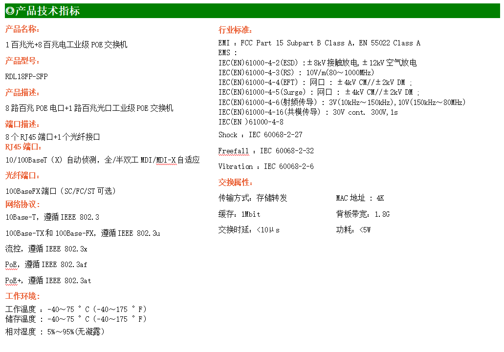 4路百兆POE電口+2路百兆FX光口工業(yè)級(jí)以太網(wǎng)交換機(jī),支持4個(gè)10Base-T/100Base-TX電口和2個(gè)100Base-X光口。產(chǎn)品符合FCC、CE、ROHS標(biāo)準(zhǔn)。RDL24FP系列交換機(jī)具有-40℃~75℃的工作溫度,具有超強(qiáng)的堅(jiān)固度能適應(yīng)各種嚴(yán)苛環(huán)境,也可以非常方便的安置在空間緊湊的控制箱中。導(dǎo)軌的安裝特性、寬溫操作及擁有IP40防護(hù)等級(jí)的外殼及LED指示燈,使RDL24FP成為一個(gè)即插即用的工業(yè)級(jí)設(shè)備,為用戶的以太網(wǎng)設(shè)備聯(lián)網(wǎng)提供可靠、便捷的解決方案。