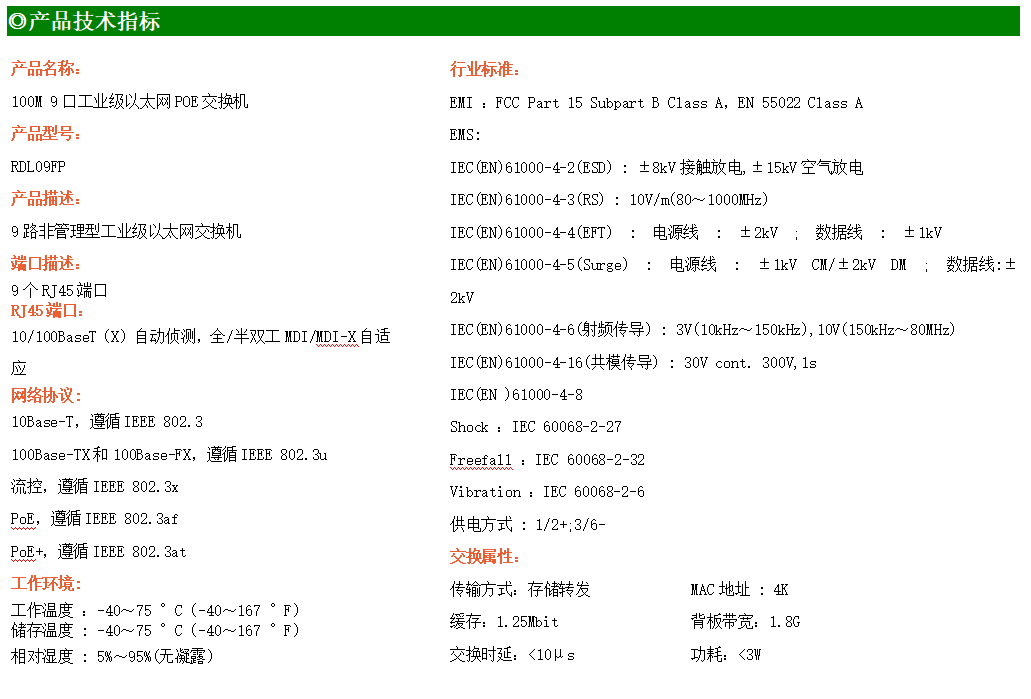 9路百兆電口工業(yè)級以太網(wǎng)交換機(jī),支持9個(gè)10Base-T/100Base-TX電口。產(chǎn)品符合FCC、CE、ROHS標(biāo)準(zhǔn)。RDL09FP交換機(jī)具有-40℃~75℃的工作溫度,具有超強(qiáng)的堅(jiān)固度能適應(yīng)各種嚴(yán)苛環(huán)境,也可以非常方便的安置在空間緊湊的控制箱中。導(dǎo)軌的安裝特性、寬溫操作及擁有IP40防護(hù)等級的外殼及LED指示燈,使RDL09FP成為一個(gè)即插即用的工業(yè)級設(shè)備,為用戶的以太網(wǎng)設(shè)備聯(lián)網(wǎng)提供可靠、便捷的解決方案。