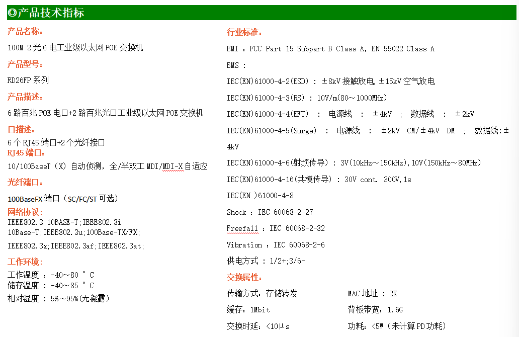 6路百兆POE電口+2路百兆FX光口工業(yè)級(jí)以太網(wǎng)交換機(jī),支持6個(gè)10Base-T/100Base-TX電口和2個(gè)100Base-X光口。產(chǎn)品符合FCC、CE、ROHS標(biāo)準(zhǔn)。RD26FP系列交換機(jī)具有-40℃~80℃的工作溫度,具有超強(qiáng)的堅(jiān)固度能適應(yīng)各種嚴(yán)苛環(huán)境,也可以非常方便的安置在空間緊湊的控制箱中。導(dǎo)軌的安裝特性、寬溫操作及擁有IP40防護(hù)等級(jí)的外殼及LED指示燈,使RD26FP成為一個(gè)即插即用的工業(yè)級(jí)設(shè)備,為用戶的以太網(wǎng)設(shè)備聯(lián)網(wǎng)提供可靠、便捷的解決方案。