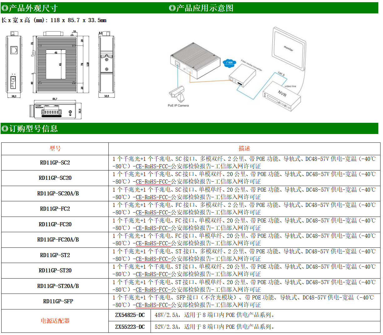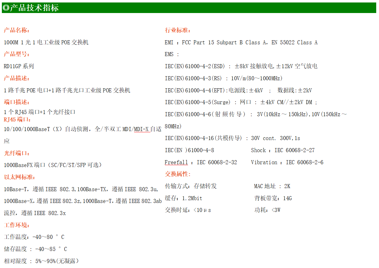 1路千兆POE電口+1路千兆FX光口工業(yè)級(jí)以太網(wǎng)POE交換機(jī),支持1個(gè)10/100Base-TX電口和1個(gè)100Base-X光口。產(chǎn)品符合FCC、CE、ROHS標(biāo)準(zhǔn)。RD11GP系列交換機(jī)具有-40℃~80℃的工作溫度,具有超強(qiáng)的堅(jiān)固度能適應(yīng)各種嚴(yán)苛環(huán)境,也可以非常方便的安置在空間緊湊的控制箱中。導(dǎo)軌的安裝特性、寬溫操作及擁有IP40防護(hù)等級(jí)的外殼及LED指示燈,使RD11GP成為一個(gè)即插即用的工業(yè)級(jí)設(shè)備,為用戶的以太網(wǎng)設(shè)備聯(lián)網(wǎng)提供可靠、便捷的解決方案。