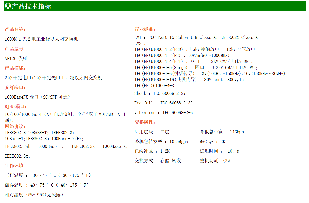 2路千兆電口+1路千兆FX光口工業級以太網交換機,支持2個100Base-T/1000Base-TX電口和1個1000Base-X光口。產品符合FCC、CE、ROHS標準。AF12G系列交換機具有-30℃~75℃的工作溫度,具有超強的堅固度能適應各種嚴苛環境,也可以非常方便的安置在空間緊湊的控制箱中。導軌的安裝特性、寬溫操作及擁有IP40防護等級的外殼及LED指示燈,使AF12G成為一個即插即用的工業級設備,為用戶的以太網設備聯網提供可靠、便捷的解決方案。