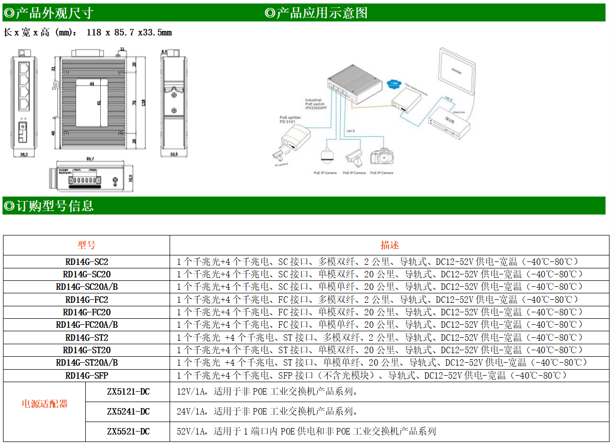 4路千兆POE電口+1路千兆FX光口工業(yè)級以太網POE交換機,支持4個10/100/1000Base-TX電口和1個1000Base-X光口。產品符合FCC、CE、ROHS標準。RD14GP系列交換機具有-40℃~80℃的工作溫度,具有超強的堅固度能適應各種嚴苛環(huán)境,也可以非常方便的安置在空間緊湊的控制箱中。導軌的安裝特性、寬溫操作及擁有IP40防護等級的外殼及LED指示燈,使RD14GP成為一個即插即用的工業(yè)級設備,為用戶的以太網設備聯網提供可靠、便捷的解決方案。