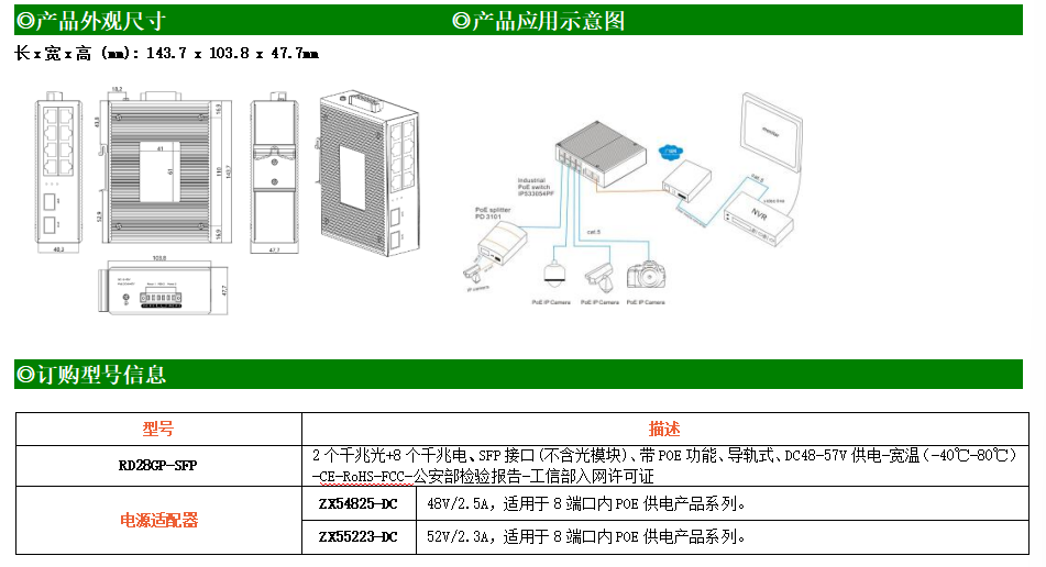 8路千兆POE電口+2路千兆FX光口工業(yè)級(jí)以太網(wǎng)POE交換機(jī),支持8個(gè)10/100/1000Base-TX電口和2個(gè)1000Base-X光口。產(chǎn)品符合FCC、CE、ROHS標(biāo)準(zhǔn)。RD28GP-SFP交換機(jī)具有-40℃~80℃的工作溫度,具有超強(qiáng)的堅(jiān)固度能適應(yīng)各種嚴(yán)苛環(huán)境,也可以非常方便的安置在空間緊湊的控制箱中。導(dǎo)軌的安裝特性、寬溫操作及擁有IP40防護(hù)等級(jí)的外殼及LED指示燈,使RD28GP-SFP成為一個(gè)即插即用的工業(yè)級(jí)設(shè)備,為用戶的以太網(wǎng)設(shè)備聯(lián)網(wǎng)提供可靠、便捷的解決方案。