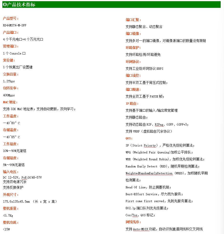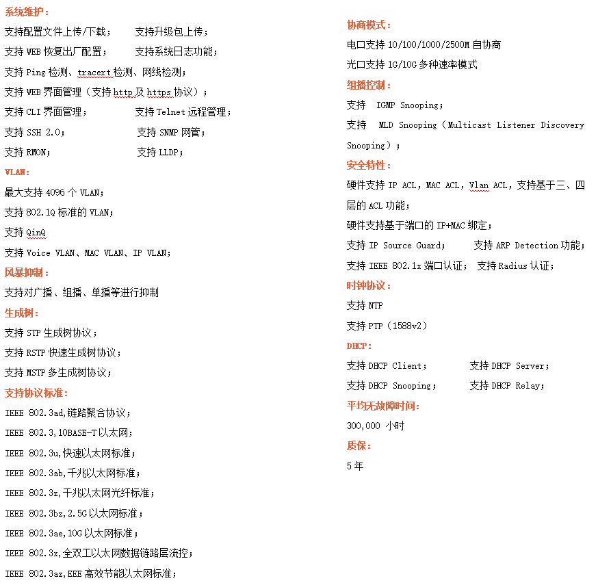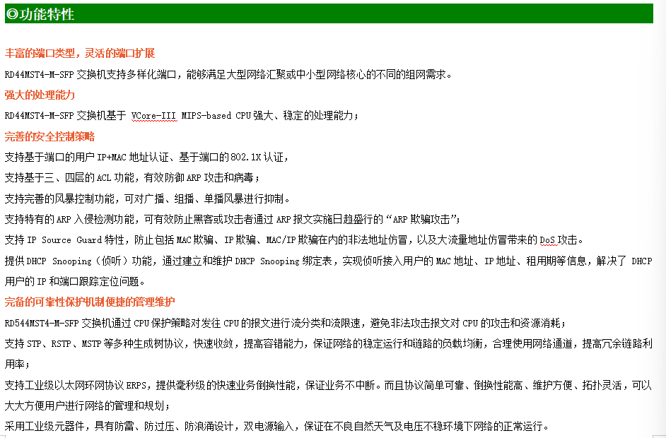 ●網(wǎng)絡(luò)冗余:支持STP/RSTP/MSTP,支持ERPS(自愈時(shí)間<20ms)