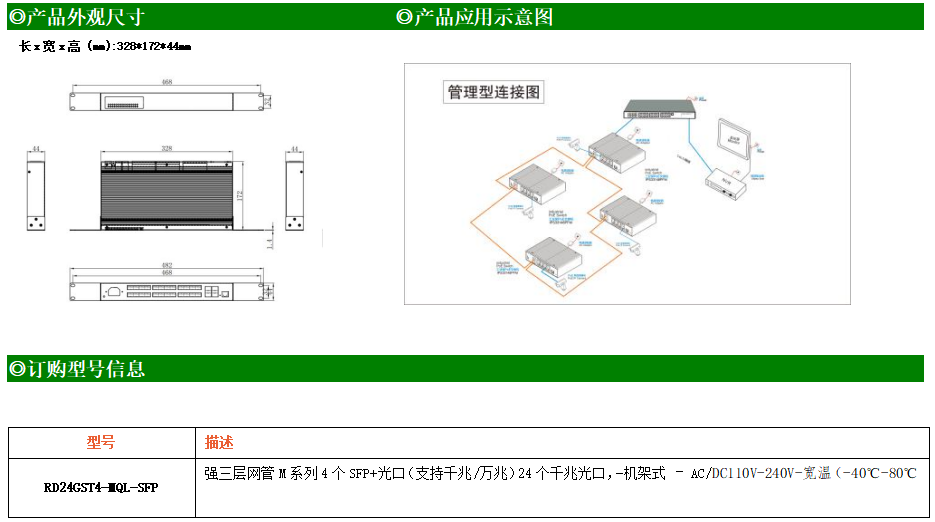 RD24GST4-MQL-SFP交換機是我司推出的一款萬兆三層交換機,配備4個萬兆SFP+光口和24個千兆光口,具備先進的硬件處理能力和最豐富的業(yè)務特性。支持IPv4/IPv6 硬件雙棧及線速轉(zhuǎn)發(fā),使客戶能夠從容應對即將帶來的IPv6 時代其提供高容量的交換能力。RD24GST4-MQL-SFP交換機具有-40℃~80℃的工作溫度,具有超強的堅固度能適應各種嚴苛環(huán)境。導軌式安裝特性、寬溫操作,使RD24GST4-MQL-SFP的交換機成為一個即插即用的工業(yè)級設備,為用戶的以太網(wǎng)設備聯(lián)網(wǎng)提供可靠、便捷的解決方案。