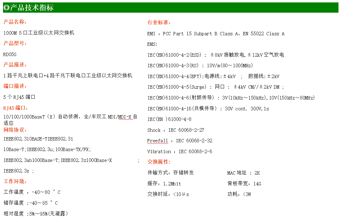 1路千兆上聯(lián)電口+4路千兆下聯(lián)電口工業(yè)級(jí)以太網(wǎng)交換機(jī),支持1個(gè)10/100/1000Base-TX上聯(lián)電口和4個(gè)10/100/1000Base-TX下聯(lián)電口。產(chǎn)品符合FCC、CE、ROHS標(biāo)準(zhǔn)。RD05G交換機(jī)具有-40℃~80℃的工作溫度,具有超強(qiáng)的堅(jiān)固度能適應(yīng)各種嚴(yán)苛環(huán)境,也可以非常方便的安置在空間緊湊的控制箱中。導(dǎo)軌的安裝特性、寬溫操作及擁有IP40防護(hù)等級(jí)的外殼及LED指示燈,使RD05G成為一個(gè)即插即用的工業(yè)級(jí)設(shè)備,為用戶的以太網(wǎng)設(shè)備聯(lián)網(wǎng)提供可靠、便捷的解決方案。