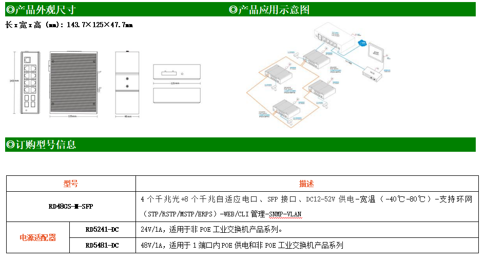 RD48GS-M-SFP是網管型工業以太網交換機,產品支持4個千兆光口和8個千兆電口;支持工業現場所需的以太網二層協議,保證通信網絡的穩定性;該系列交換機采用低功耗、無風扇設計,確保無噪聲干擾,同時支持-40~80℃工作溫度和良好的EMC電磁兼容性能,保證在惡劣的工業環境中保持穩定的工作,為工廠自動化,智能交通,視頻監控等工業應用領域組建快速穩定的網絡終端接入網絡提供安全可靠的解決方案。