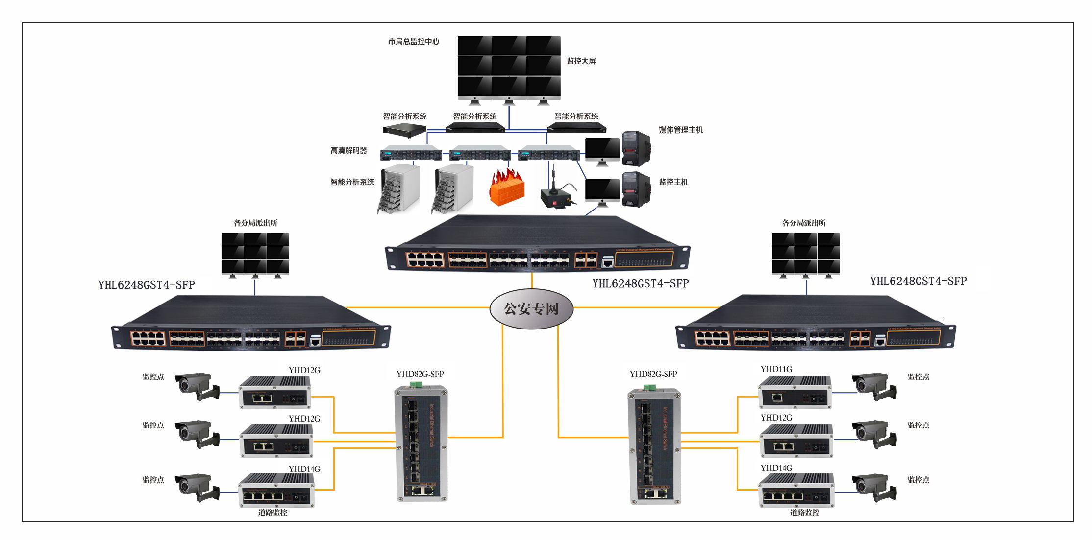 宇航在解決方案中采用YHL6248GST4-SFP, YHD28G, YHD14G,YHD12G,根據(jù)各個城市安防監(jiān)控點,安裝定點攝像機,快球,解碼器,報警探頭等設(shè)備,通過光纖將視音信號匯聚到派出所光纖匯聚點,將數(shù)字視頻傳送到遠程分局監(jiān)控中心, 保障各個監(jiān)控點監(jiān)控到位,提高網(wǎng)絡(luò)數(shù)據(jù)傳輸高效性。
