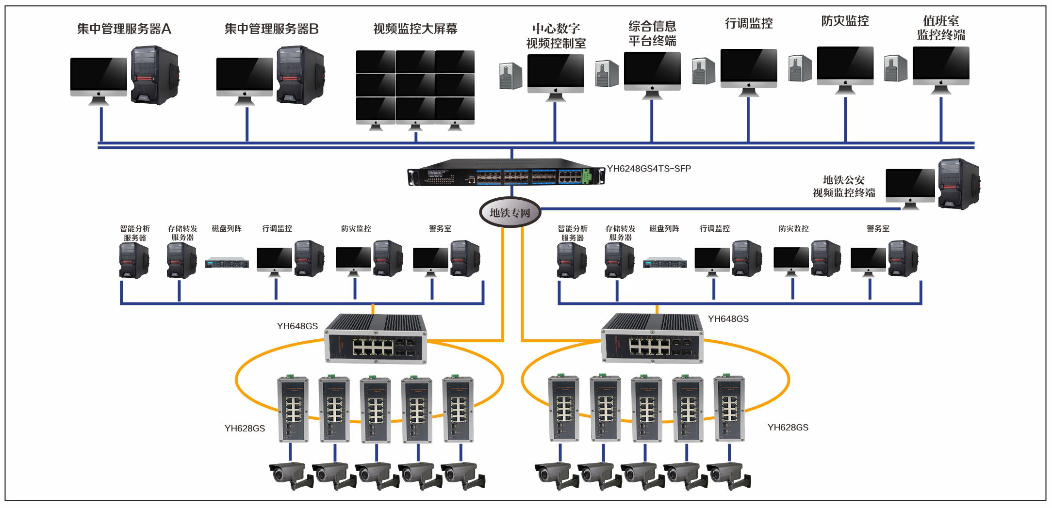 宇航在地鐵IP視頻監(jiān)控解決方案中采用了YH6248GS-SFP,YH628GS,地鐵視頻監(jiān)控系統(tǒng)分為兩部分:運(yùn)營視頻監(jiān)控和公安視頻監(jiān)控。運(yùn)營的調(diào)度員需要實(shí)時(shí)監(jiān)控車站,車內(nèi)客流及乘客上下車等情況,以確保運(yùn)營安全,快捷,準(zhǔn)時(shí),在發(fā)生緊急情況,如火災(zāi),反恐,自然災(zāi)害等,可為相關(guān)人員提供事發(fā)現(xiàn)場實(shí)時(shí)的圖像。在軌道交通設(shè)備監(jiān)控系統(tǒng)解決方案中采用維修與備用中心采用環(huán)網(wǎng)交換機(jī)進(jìn)行環(huán)網(wǎng)冗余連接,線路中心BAS系統(tǒng)采用核心交換機(jī)主設(shè)備連接模式與核心交換機(jī)相連,保障了各個(gè)監(jiān)控點(diǎn)監(jiān)控到位,與正常通信提高網(wǎng)絡(luò)數(shù)據(jù)傳輸高效性。