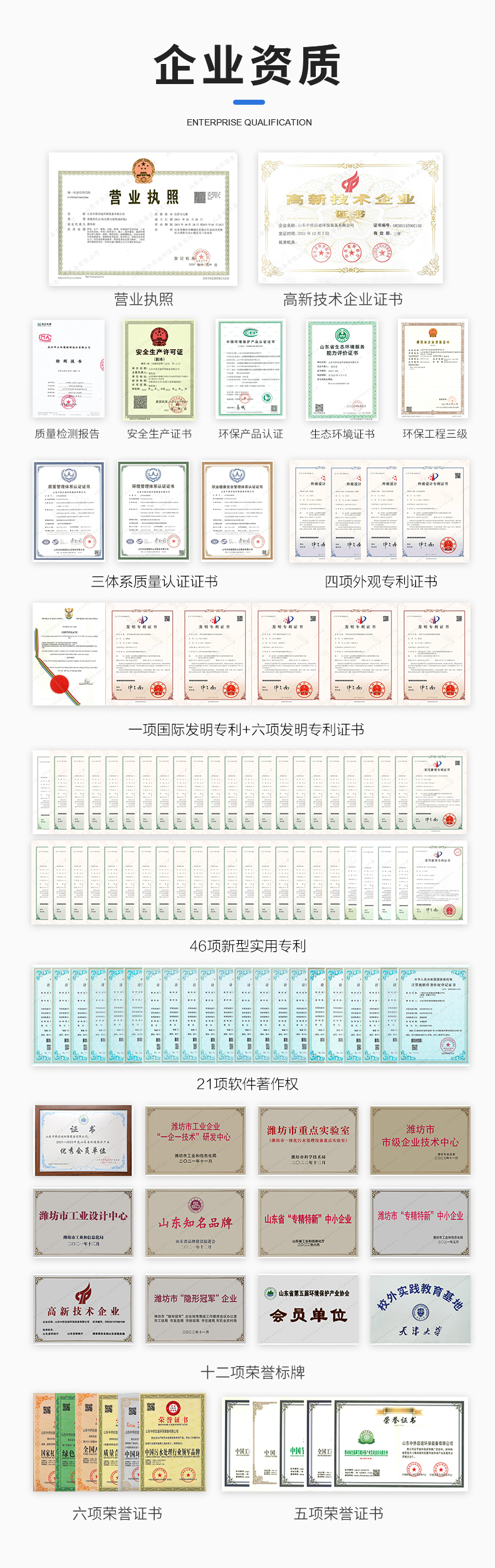 公司具有雄厚的技術實力和一批獻身于水處理事業的科技人員,具備環保工程專業承包三級資質、安全生產許可證、50余項實用新型專利、5項發明專利及1項國際發明專利、27項軟件著作權、通過中環協CEP認證、三體系認證證書;同時擁有“專精特新”“企業技術中心”“山東知名品牌”“一企一技術研發中心”“濰坊市工業設計中心”“濰坊市隱形冠軍”等多項稱號和榮譽;擁有經驗豐富的設計、運算團隊,有著高水平、高素質的生產團隊,配套高粘度專業服務的業務人員,細致高效、響應快速的售后團隊。