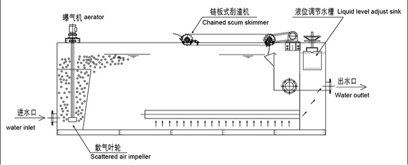 渦凹氣浮機是一種主要用于去除工業或城市污水中的油脂、膠狀物及固體懸浮物而設計的新型污水處理設備,系統主要由曝氣裝置、刮渣裝置和排渣裝置組成,其中曝氣裝置主要是帶有專利性質的渦凹曝氣機,刮渣裝置主要由刮渣機和牽引鏈條組成。渦凹曝氣系統結構示意圖。