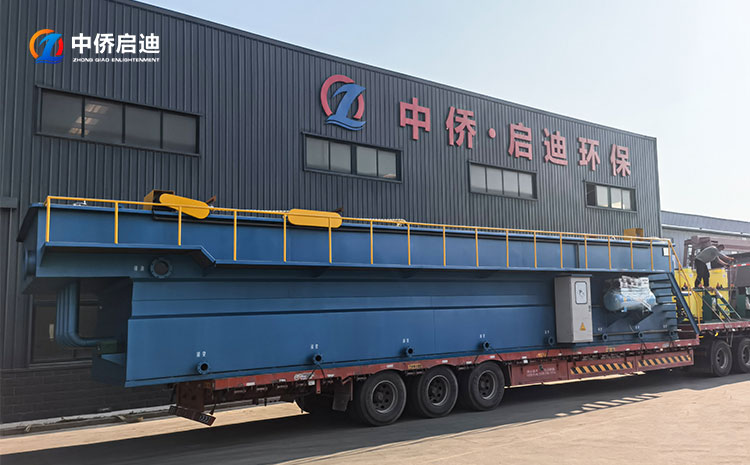 我們中僑啟迪的溶氣氣浮機設備主體為矩形鋼制結構。主要部件由氣泵、空壓機、儲氣罐、矩形箱體、氣浮系統、刮泥系統等組成。